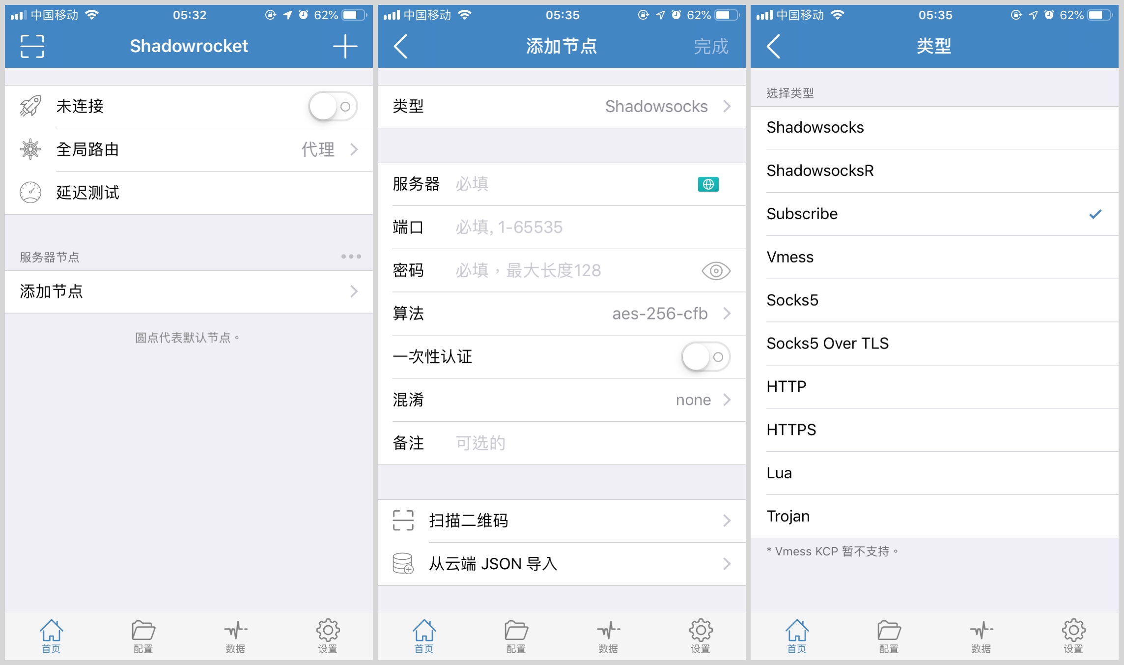 Shadowrocket 是在 iOS 平台上的客户端软件,支持 Shadowsocks、ShadowsocksR 以及 VMess 协议。