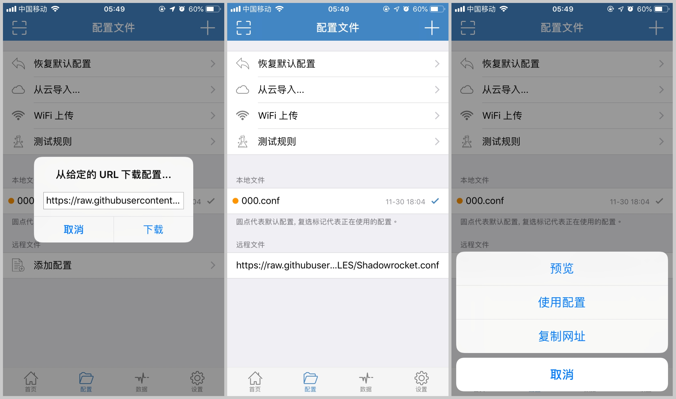 在弹出的输入框中输入「https://raw.githubusercontent.com/Hackl0us/Surge-Rule-Snippets/master/LAZY_RULES/Shadowrocket.conf」可长按链接拷贝,并点击下载。