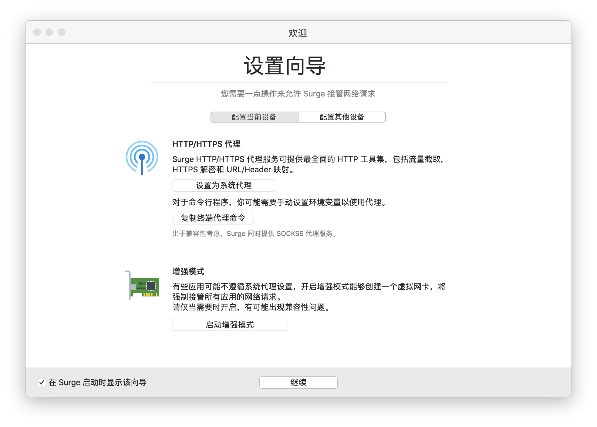 首次打开 Surge 会弹出设置向导,点击中间部分的 设置为系统代理(需要在系统中安装一个帮助程序,需要输入您的 macOS 密码),随后点击下方的继续。