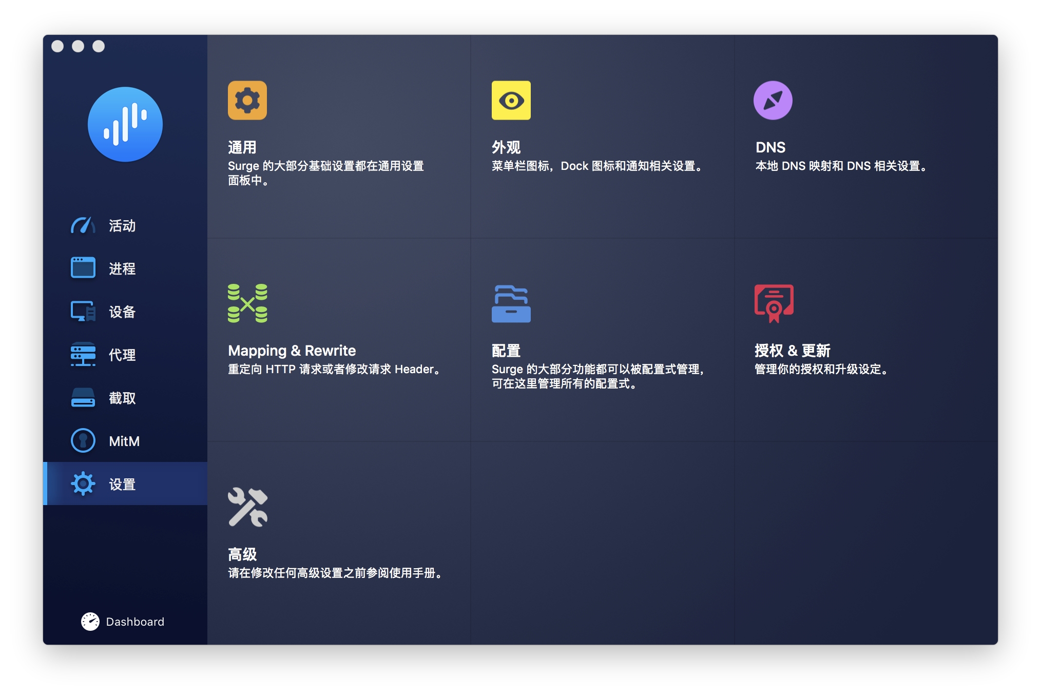 在 Surge 主界面中点击右侧导航栏的 设置,随后点击中间的 配置。