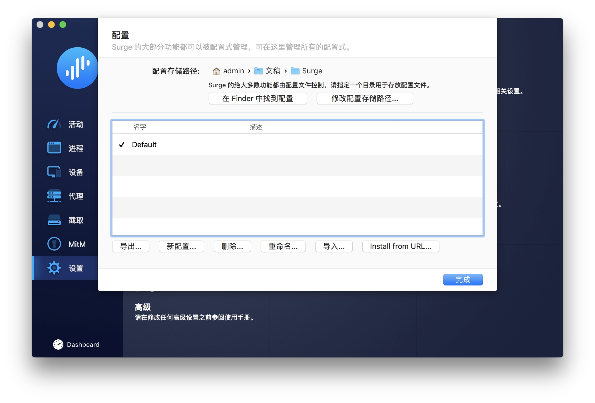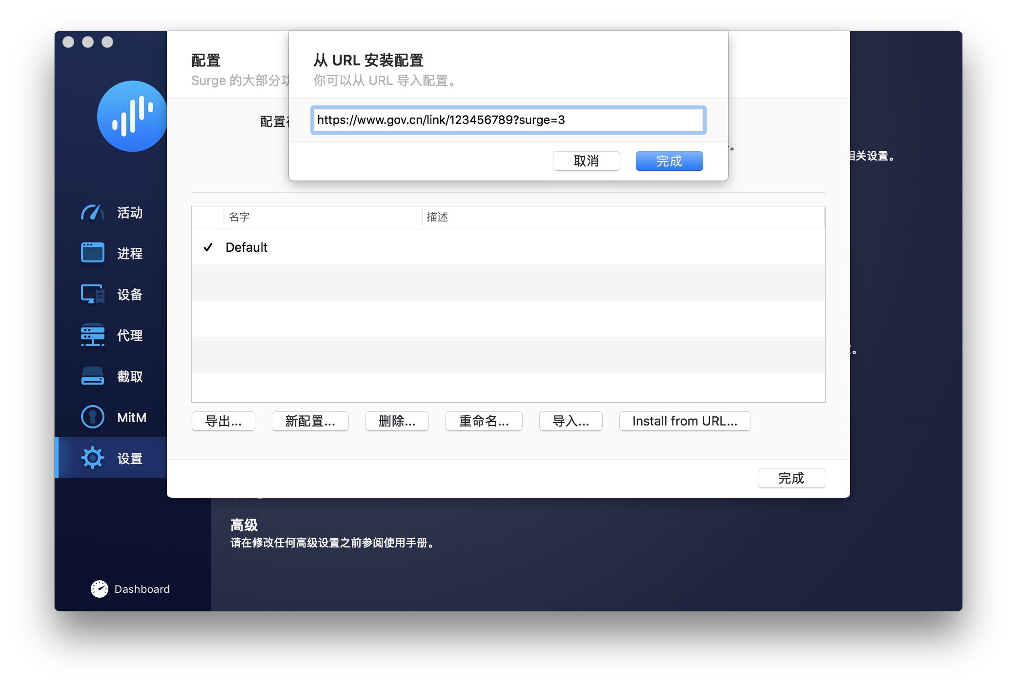 点击其中的 Install from URL,在弹出的输入框中粘贴上方 获取订阅 中您对应的 Surge 版本的订阅链接并点击 完成。